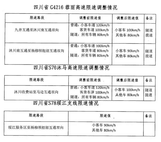 G4216蓉丽高速沐川南互通至杨柳坝枢纽互通双向限速调整。调整前,小客车道限速每小时100公里,客货车道限速每小时80公里,隧道内所有车辆限速每小时80公里。调整后,全路段(包括隧道)小客车限速每小时90公里,其他车辆限速每小时80公里。