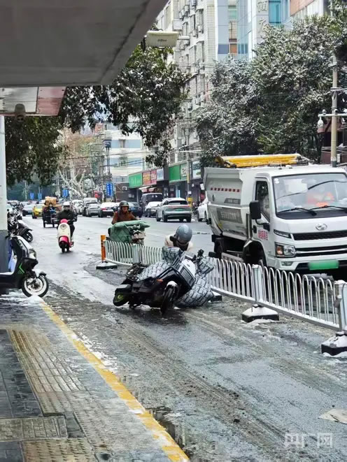 雨雪天市民骑车摔倒(央广网记者 王锡斐 摄)