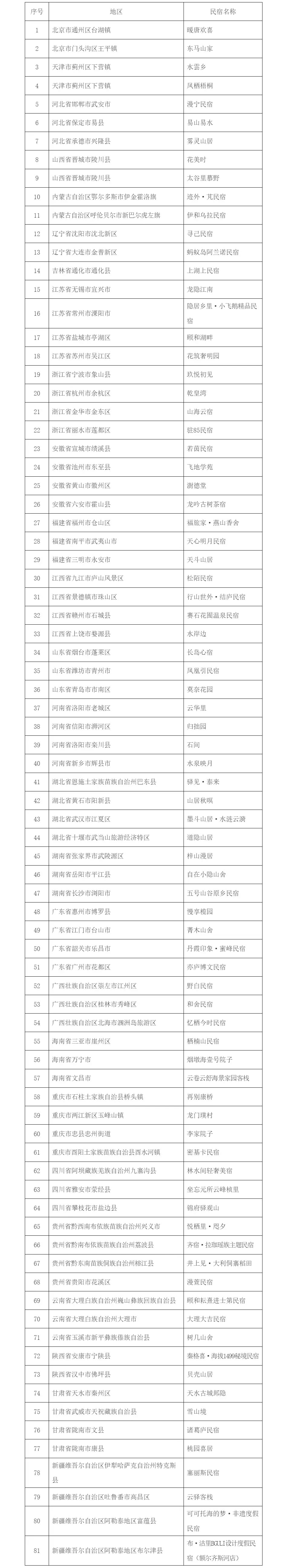 央广网北京1月27日消息(记者 宋雪)据文化和旅游部网站消息,根据《〈旅游民宿基本要求与等级划分〉(GB/T 41648—2022)实施工作导则》,81家旅游民宿符合全国甲级旅游民宿标准,104家旅游民宿符合全国乙级旅游民宿标准。