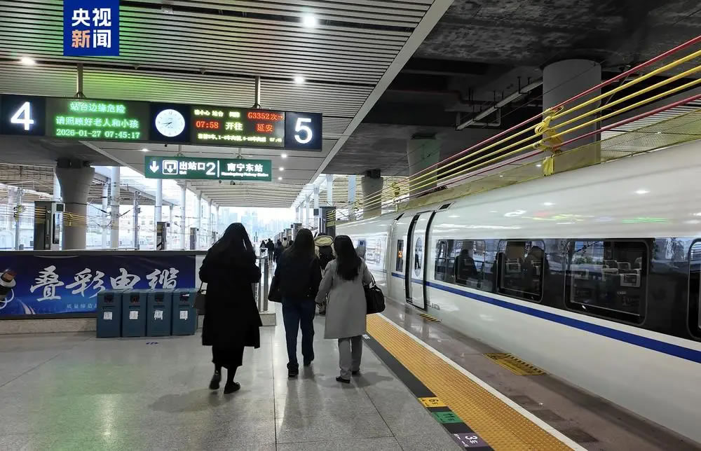 记者从国铁南宁局获悉,1月27日7时58分,首趟南宁东至延安的动车组列车G3352次驶出站台,标志着“绿城”南宁与“革命圣地”延安实现高铁直通,填补了两地无直达高铁的空白。