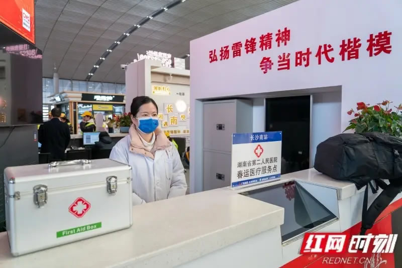 为保障春运期间旅客健康出行,湖南多个车站升级了医疗服务措施。长沙南站联合湖南省第二人民医院,在“湘遇长南雷锋服务站”设立了便民医疗点,配有医护人员驻守,提供免费的健康咨询、医疗救护以及基础应急药品与设备。