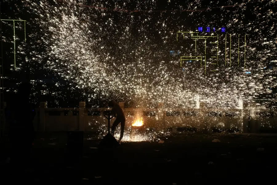 夜幕降临,非遗打铁花表演率先登场。匠人们将滚烫的铁水奋力击打,万千金花在夜空绽放,形成“火树银花不夜天”的壮观景象。这门千年技艺承载着人们对风调雨顺、国泰民安的美好祈愿。