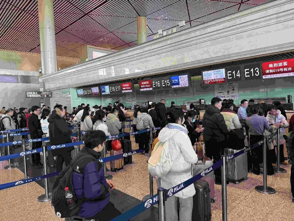 春节假期以来,哈尔滨机场客流持续高位运行,呈现出“客流量大、宽体机多、联动性强”的运行态势。根据预测,2月20日起,哈尔滨机场进入返程高峰期,其中2月23日(正月初七)为整个春运期间客流峰值日,预计当天运送旅客超10万人次,返程高峰期呈现游客集中返程,峰值高、周期短的特点。据统计,从哈尔滨飞往北京、上海、广州、深圳、重庆等城市的部分航班客座率接近100%,从北京、上海、广州、深圳、海口、三亚等城市飞往哈尔滨的航班客座率达到90%。