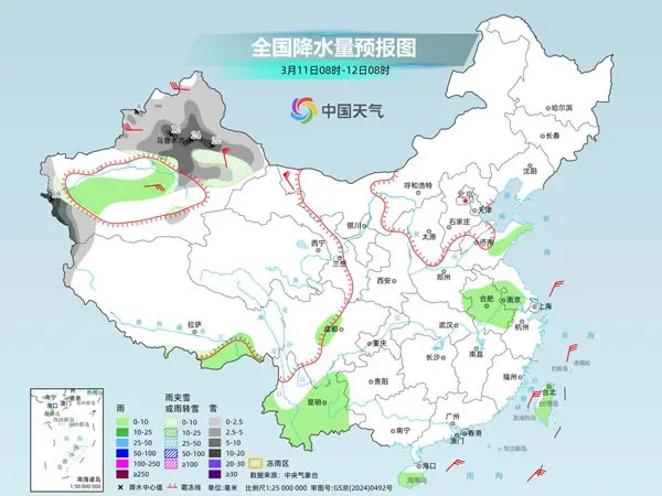明天,新疆北疆和南疆西部山区等地部分地区有小到中雪或雨夹雪,其中,新疆沿天山地区和南疆西部山区等地部分地区有大到暴雪,局地大暴雪。新疆南疆盆地、西藏东南部、山东半岛、安徽大部、江苏南部、云南大部、海南岛中南部、台湾岛等地部分地区有小雨。