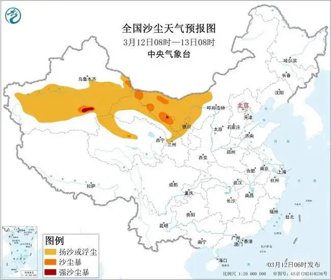 受大风天气影响,预计3月12日08时至13日08时,新疆东部和南部、内蒙古西部、甘肃西部、青海北部、宁夏中北部等地的部分地区有扬沙或浮尘天气,其中,新疆南疆盆地东部、内蒙古西部、甘肃西部局地有沙尘暴或强沙尘暴。