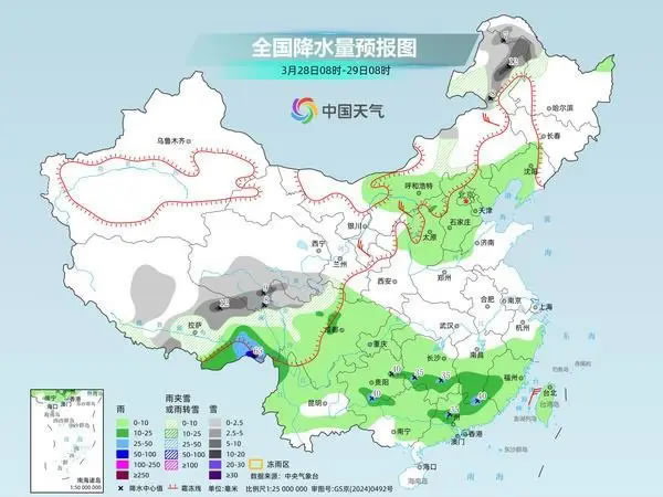 明天,内蒙古东北部、黑龙江西北部和中部、吉林东部、新疆南部、西藏西部、青海东部和西部、甘肃南部、川西高原北部等地部分地区有小到中雪或雨夹雪,其中,内蒙古东北部、黑龙江西北部、青海东部、新疆南部等地部分地区有大雪或暴雪。西北地区东南部、江淮西部、江汉南部、江南大部、华南北部及重庆东部、贵州东部等地部分地区有中到大雨,其中,湖南西部和东北部、江西中北部等地部分地区有暴雨或大暴雨。