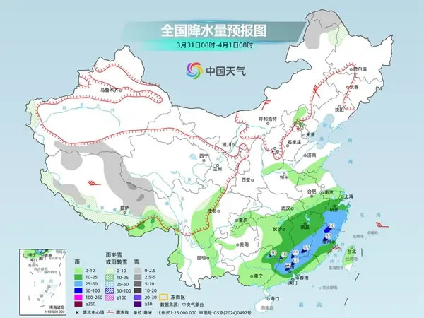 中央气象台预计,今天,内蒙古东北部、黑龙江西北部、新疆南疆盆地和西部山区、西藏大部、青海西南部等地部分地区有小到中雪或雨夹雪;江淮南部、江南大部、华南北部和东部、西藏东南部等地部分地区有中到大雨,其中,广西东北部、广东中北部、湖南南部、江西南部和东部、福建西部和北部、浙江中南部等地部分地区有暴雨。