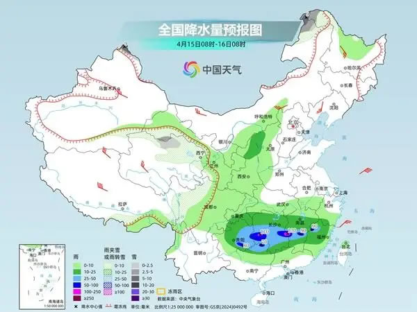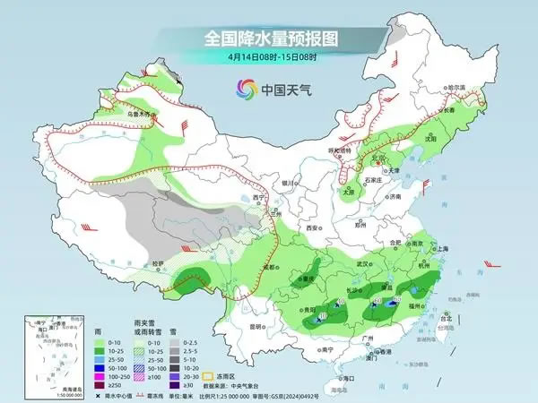 昨天,南方仍有大范围降雨,同时青藏高原多地出现降雪天气。监测显示,昨天8时至今天6时,湖南南部、江西南部、福建西北部等地部分地区出现中到大雨,湖南衡阳、江西赣州等局地大暴雨;青海北部和东部、西藏东部、川西高原等地部分地区出现中到大雪或雨夹雪,四川甘孜局地暴雪。