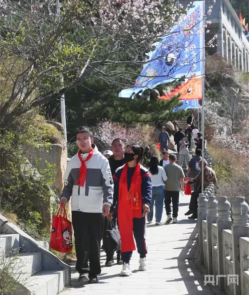 沿着青石步道拾级而上,步步皆景、处处入画。花枝随风轻舒,花瓣簌簌飘落,铺就一条条浪漫花径;林间鸟鸣清脆,与游客欢声笑语交织,汇成动听的春日交响曲;山间云影流转,阳光透过花枝洒下斑驳光影,一步一景皆藏诗意。游客们或漫步花海深呼吸,沉醉自然野趣;或举手机相机驻足打卡,定格春日盛景;或结伴边走边聊,赏雄奇风光、品道教文化,尽享踏青惬意。