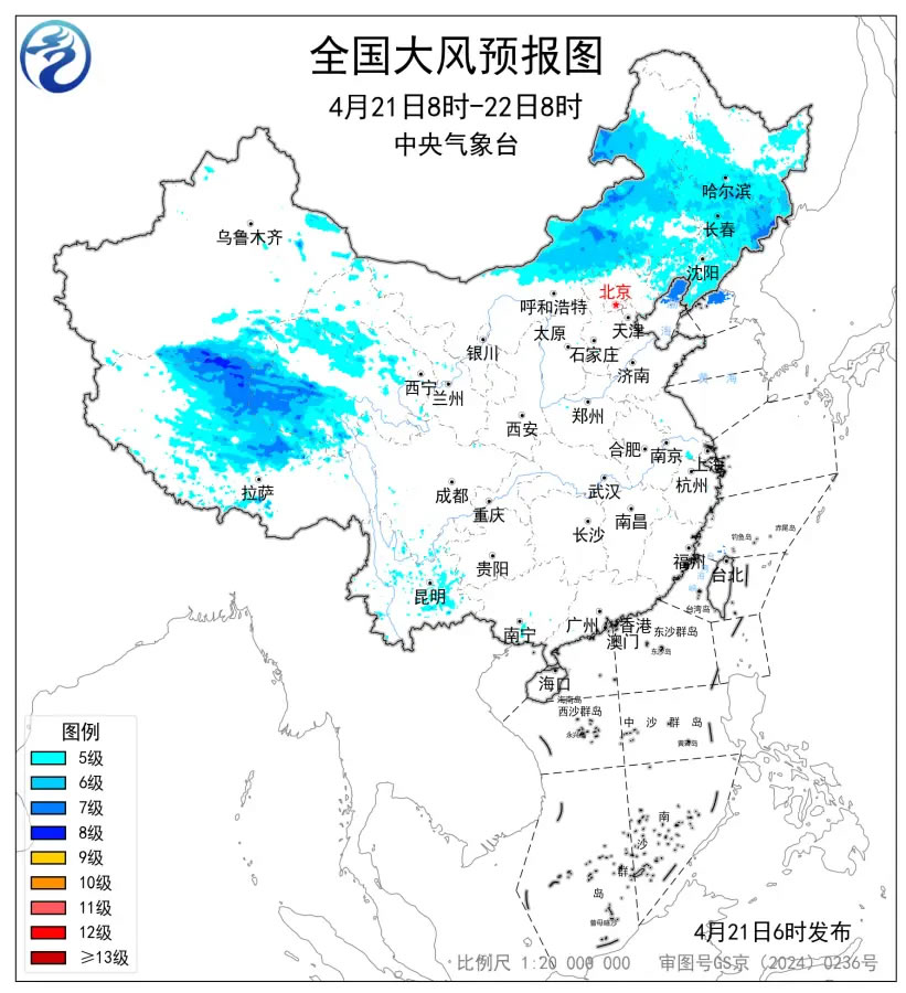 大风蓝色预警:预计,4月21日8时至22日8时,内蒙古中东部、黑龙江中南部、吉林、辽宁以及新疆南疆盆地、西藏北部、青海西部等地部分地区有5~7级风,阵风8~9级,渤海北部海域、黄海北部海域将有7级、阵风8级的风。