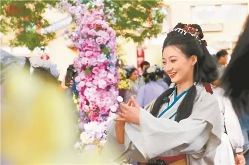4月15日,游客在开封清明上河园景区“大宋簪花游园会”上游玩。本报全媒体记者 王铮 摄