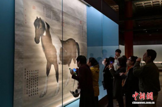 “神骏:故宫书画艺术中的马世界”展览4月21日在故宫博物院文华殿开幕,图为展览现场。中新社记者 田雨昊 摄