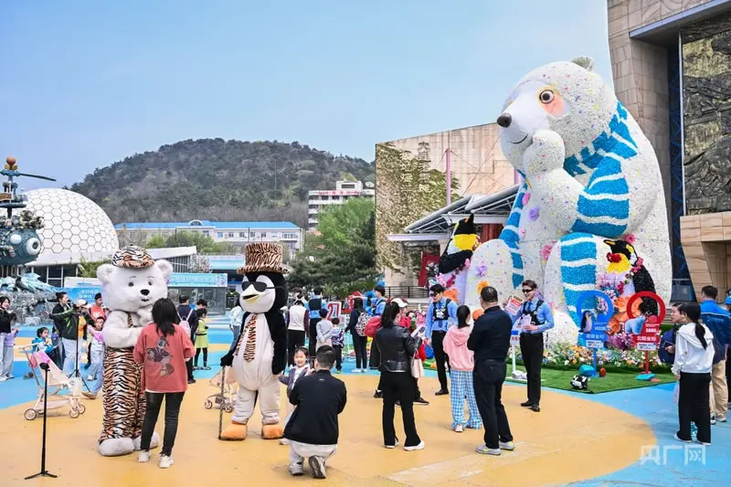 央广网大连4月28日消息(记者易博闻)五一假期临近,大连老虎滩海洋公园于近日启动“2026五一山海花漾季”主题活动。今年恰逢园内极地海洋动物馆开馆24周年,一座高达8.8米的“繁花巨熊 熊霸霸”主题雕塑作为东北地区首创的全新山海地标正式亮相,吸引市民游客前来感受春日海洋文化氛围。