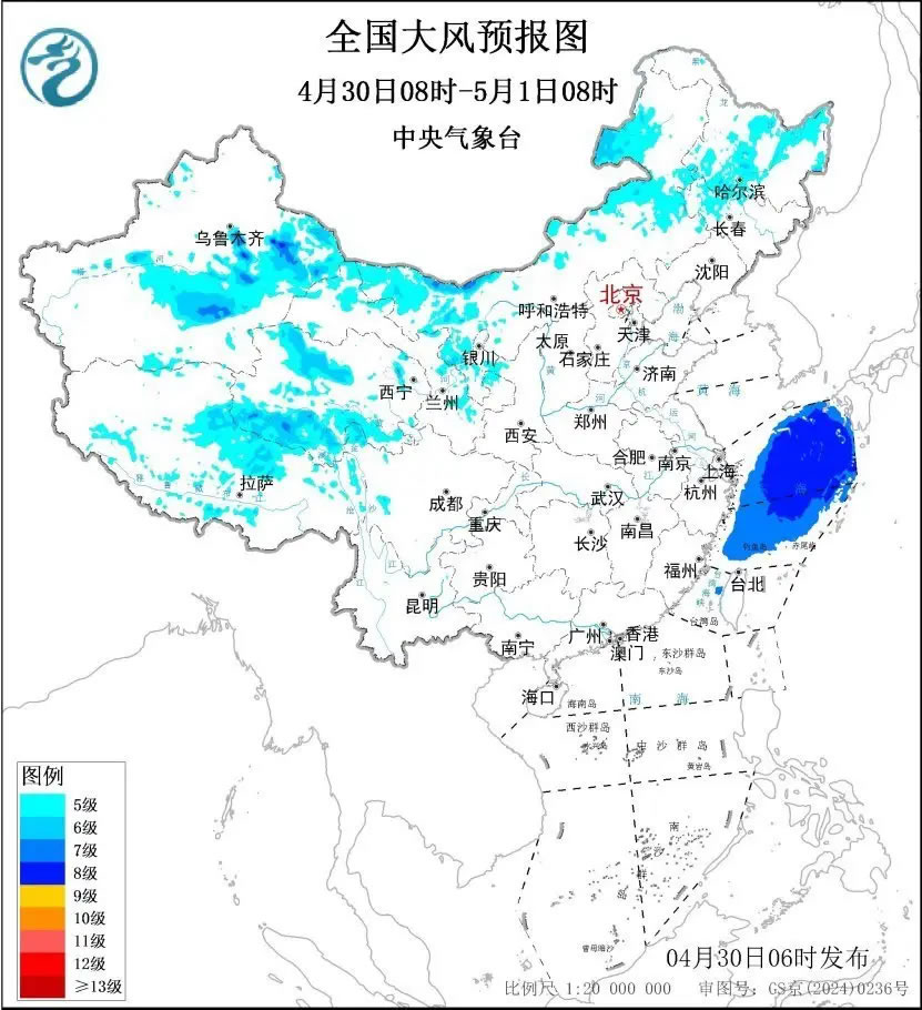 中央气象台4月30日6时继续发布大风蓝色预警: