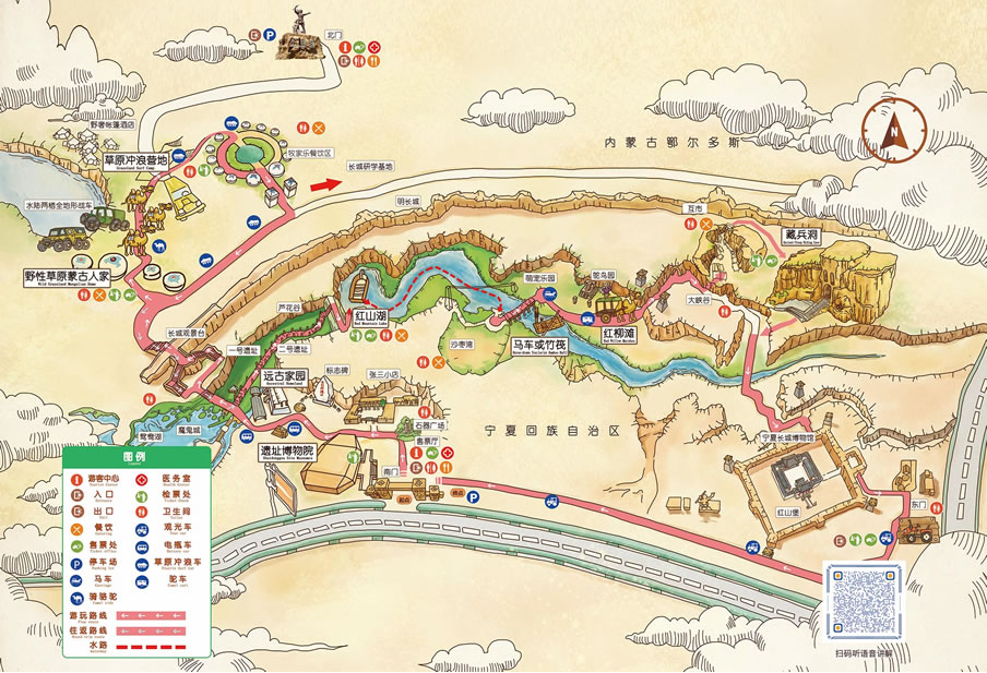 水洞沟遗址旅游区内明代军事立体防御体系区是由明长城、藏兵洞、边沟、大峡谷、红山堡、瓮城等共同构成的。