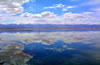 茶卡盐湖夹在祁连山支脉完颜通布山和昆仑山支脉旺尕秀山之间,两山常年积雪,雪山倒影在湖面,形成“湖水与长天一色,盐湖与雪峰同辉”壮美的青藏高原独特自然风光。