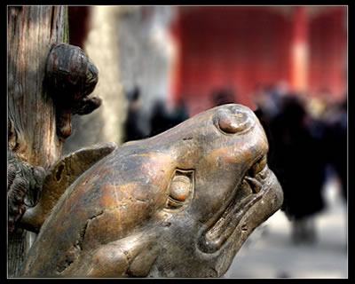 北出曲阜城门,就见两行仓桧翠柏,如龙如虬,夹道而立,这就是孔林神道。道中巍然屹立着一座万古长春坊。这是一座六楹精雕的石坊,其支撑的6根石柱上,两面蹲踞着12个神态不同的石狮子。坊中的“万古长春”四字,为明万历二十二年(公元1594年)初建时所刻,清雍正年间却又在坊上刻了“清雍正十年七月奉敕重修”的字样。石坊上雕有盘龙、舞凤、麒麟、骏马、斑鹿、团花、祥云等,中雕二龙戏珠,旁陪丹凤朝阳纹饰,整个石坊气势宏伟,造型优美。