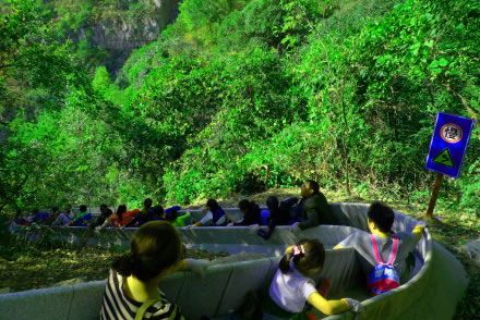 滑道自高门洞起,至空中玻璃漂流入口处止,长约千米。此处山坡陡斜,树木茂密,滑道从树丛中顺山势蜿蜒而下,看似蟒行山间草丛中。其中有八个急弯,落差较大,乘坐滑道飞速从山顶滑至山腰,惊险刺激,乐趣无穷。