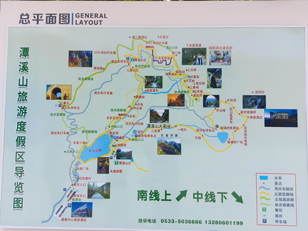 旅游中线:全程约1小时,以农家风光、休闲娱乐为特色,主要景点有:潭溪山大瀑布、如意广场、九龙潭、潭溪山庄、自醉亭、潜龙洞、逍遥桥、潭溪山古酒坊、农家田园、后哨石屋、樱桃峪、神龟探路、姊妹瀑布、儿童撒野乐园、乘观光车下山。 |