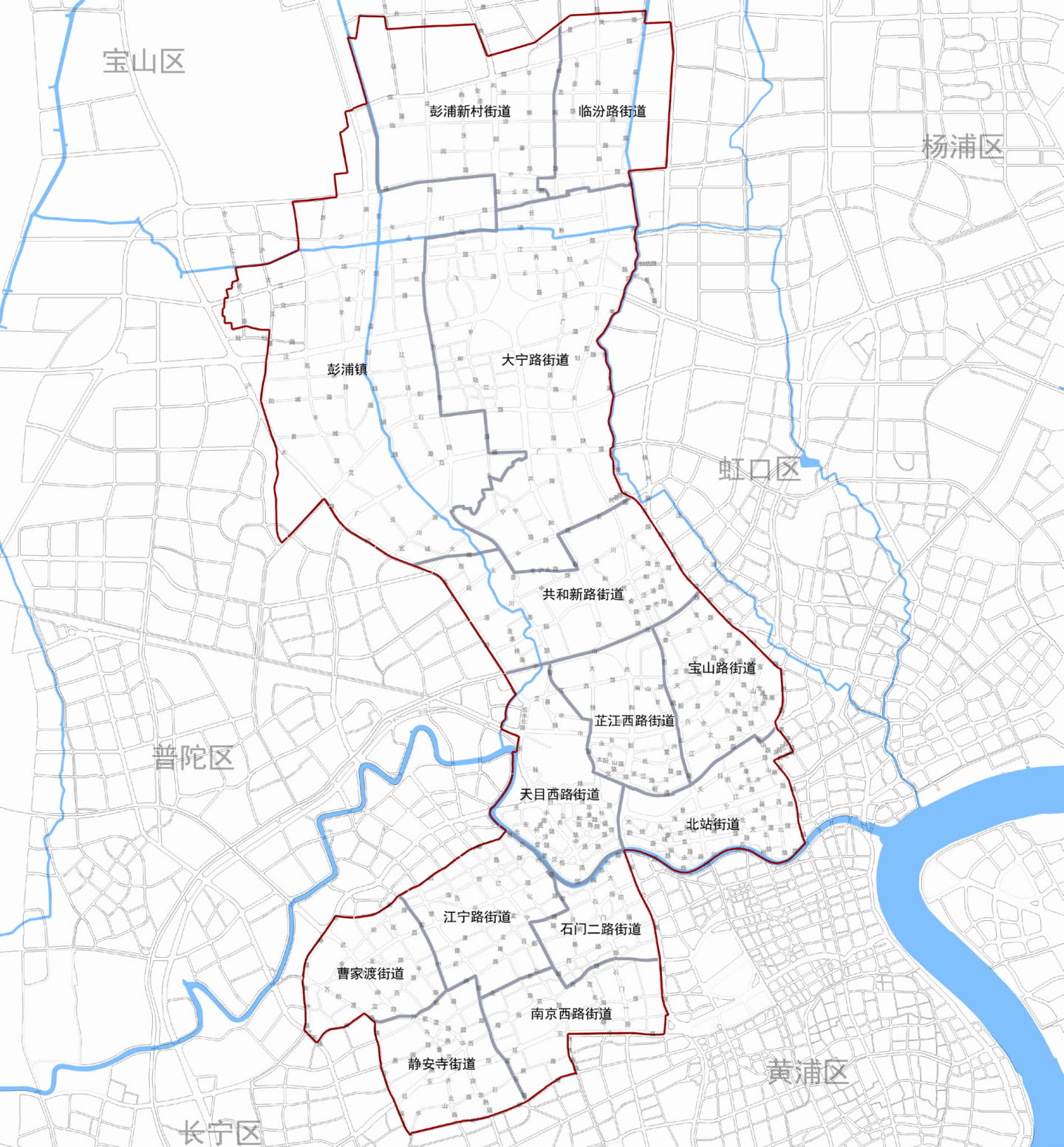 街道:静安寺街道、曹家渡街道、江宁路街道、石门二路街道、南京西路街道、天目西路街道、北站街道、宝山路街道、芷江西路街道、共和新路街道、大宁路街道、彭浦新村街道、临汾路街道