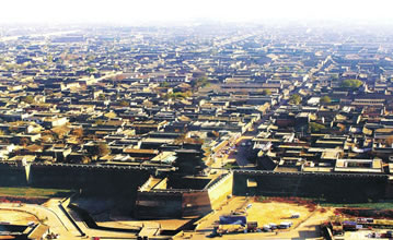 平遥古城由城墙、店铺、街道、寺庙、 民居等共同组成一个庞大的建筑群,整座城池对称布局,以市楼为轴心,以南大街为轴线,形成左城隍、右衙署,左文庙、右武庙,东道观、西寺庙的封建礼制格局,总占地面积2.25平方千米;城内街道格局为“土”字形,整体布局遵从八卦方位,由四大街、八小巷、七十二条蚰蜒巷构成八卦图案,南大街、东大街、西大街、衙门街和城隍庙街形成干字型商业街。