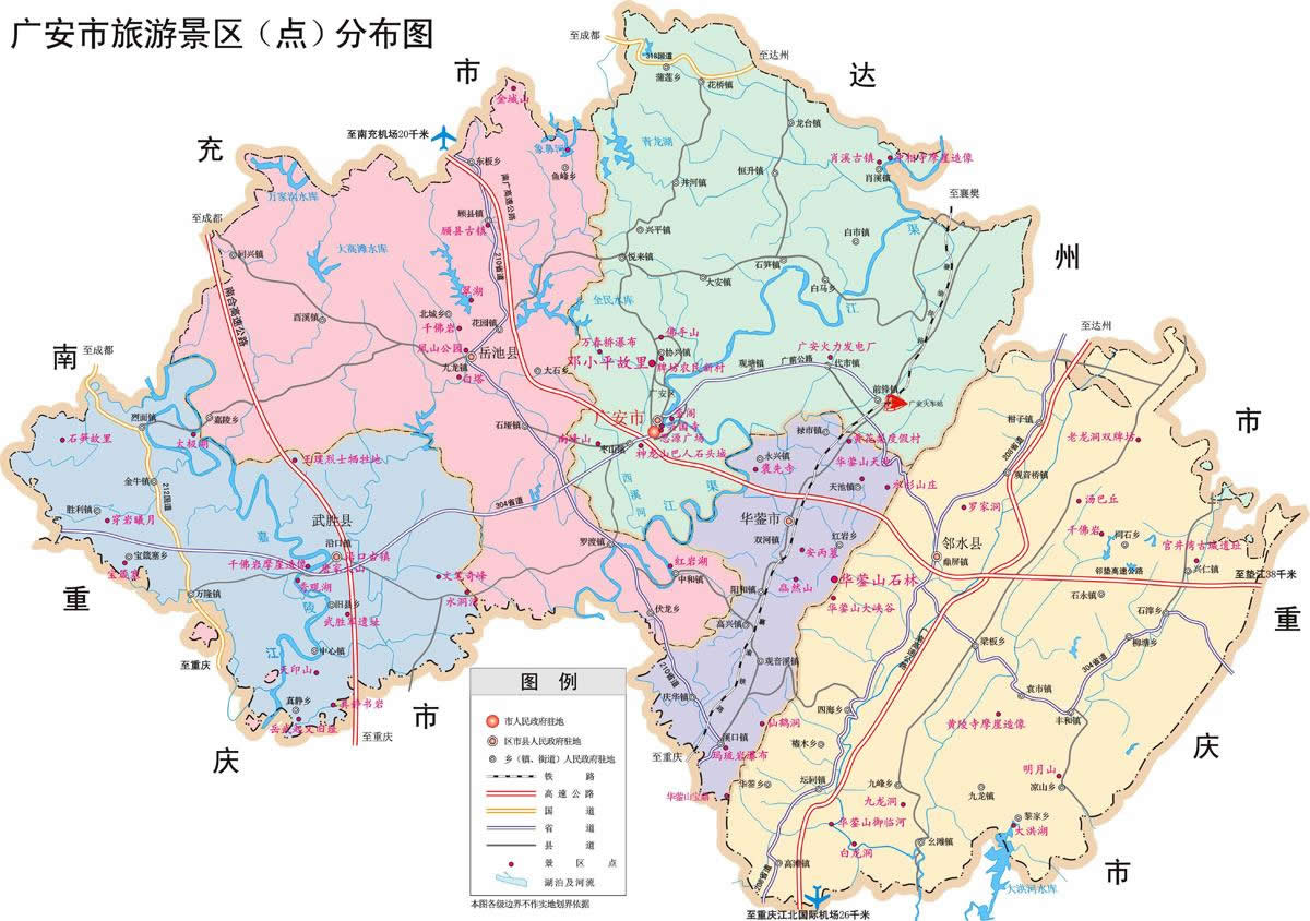 广安市辖2个市辖区、3个县、代管1个县级市: