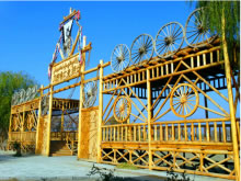 风格独特、气势宏伟的大门就是刀郎人民俗村寨门。造型似刀郎人英雄男儿形象,体现刀郎人的勇敢彪悍、不屈不挠、勤劳智慧、热爱子民的硬汉精神。