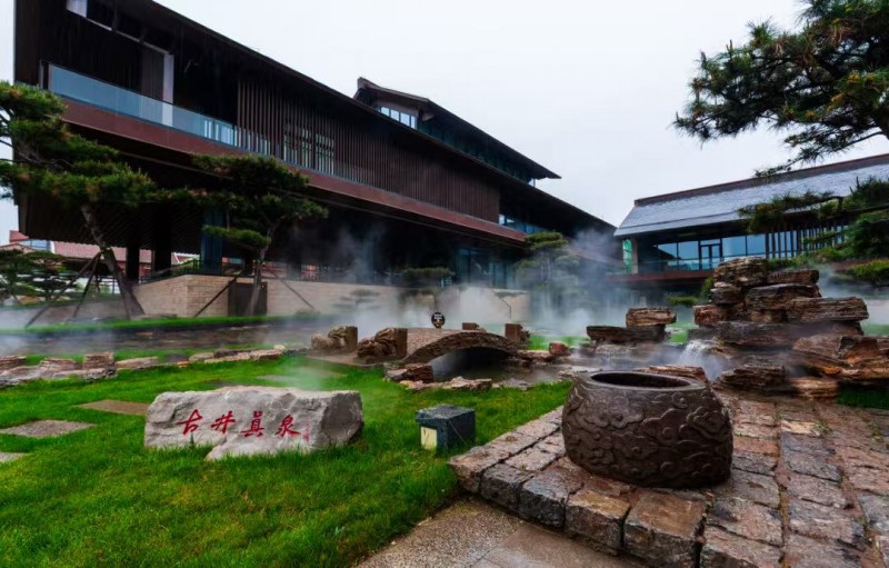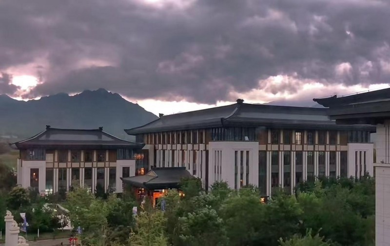 那白,不再是日光下格外耀眼的白,而是闪着被雨水调和了的,一种温润如玉的光泽;那瓦,也不再是朴素的灰,而是透着水光,泛着乌亮的颜色,像巨鸟收敛的羽翼,沉静地栖息着。松风馆静默在青松的环抱里,雨水顺着松针的尖端,凝成一颗颗晶莹的,欲坠未坠的珠子。远远望去,太行山原本雄浑苍劲的轮廓,在雨幕里渐渐化作宣纸上晕开的青黛,而缭绕的云雾,恰似画家笔下有意无意的留白。此刻,唯有雨水从高处滴落,敲在石上、叶上的声响,正应了那句“青松凝露翠,寒色隐泉声”的幽静与禅意。