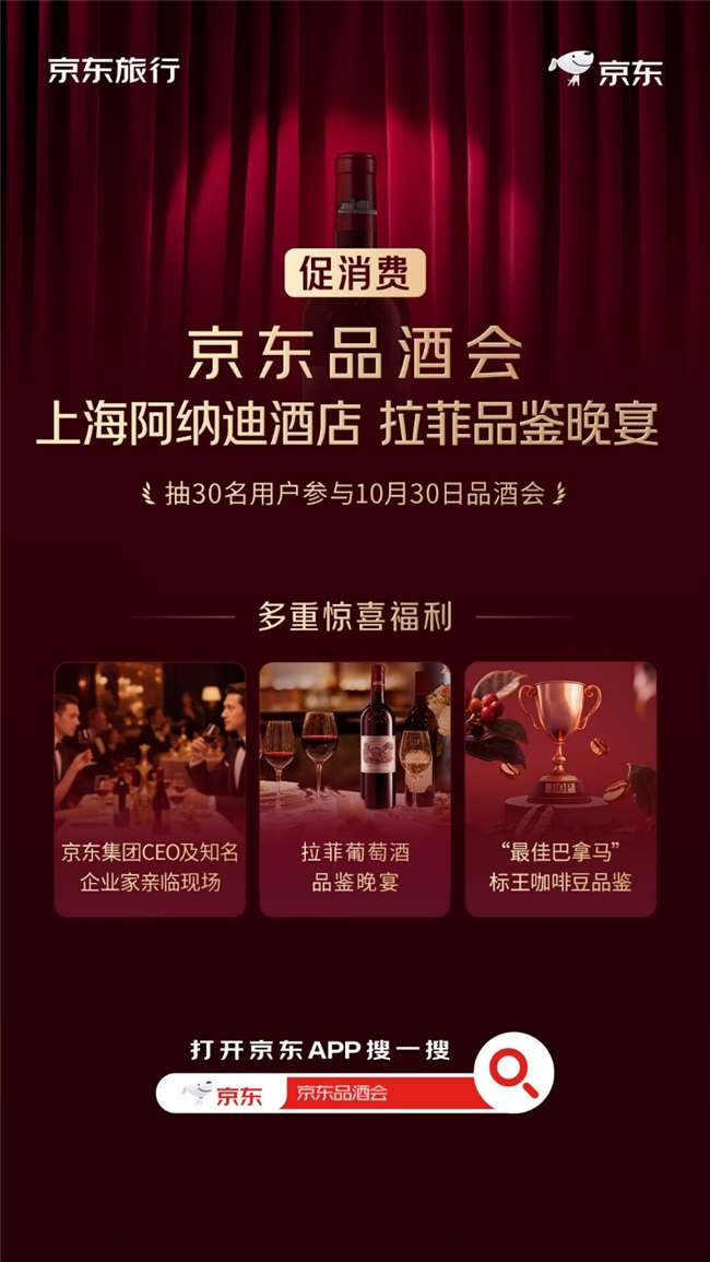 继9月16日首场京东品酒会爆火,官宣24小时百万人涌入活动会场后,时值京东11.11期间,第二场京东品酒会即将来袭。10月30日,京东旅行将在上海阿纳迪酒店举办第二场品酒会,京东集团SEC副主席、京东集团CEO许冉及其他知名企业家现身现场,和用户一起“品名酒,交朋友”。