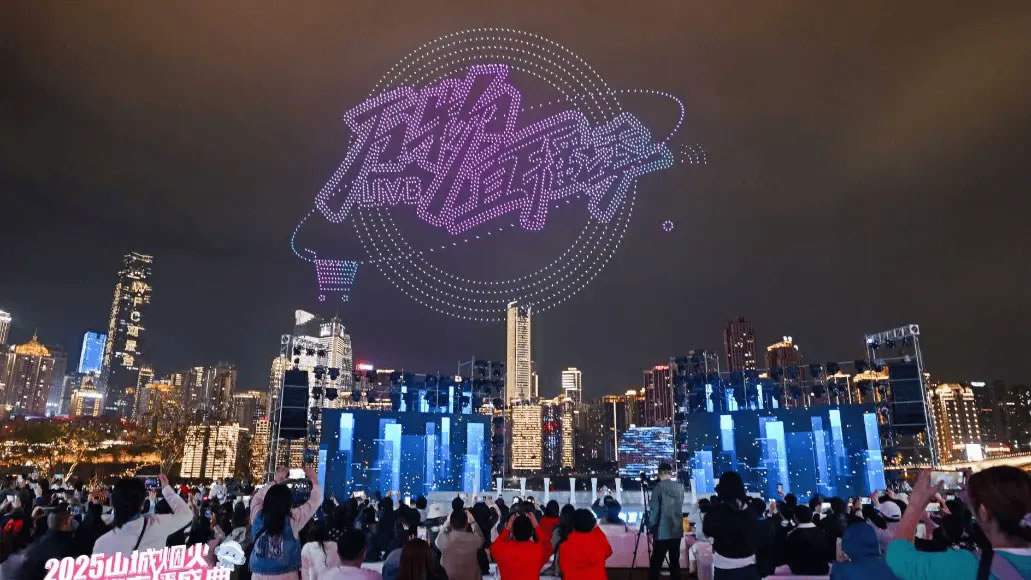 20时08分,五千架无人机腾空而起,在夜空中呈现“渝小e”“陈麻花”“萍姐火锅”等定制画面,将品牌故事升华为城市记忆。