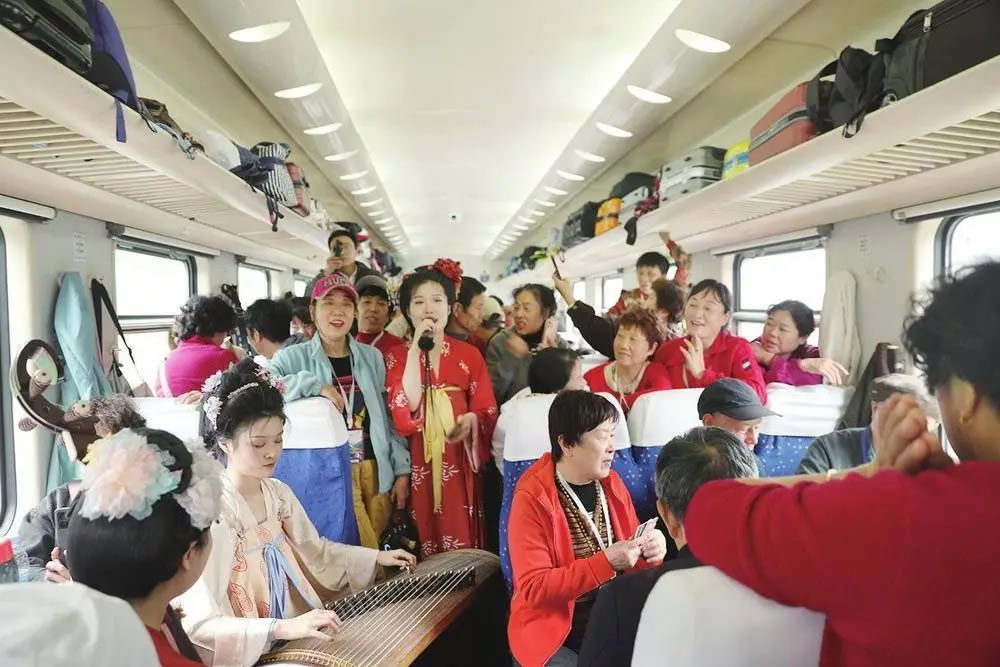 秋日的旅途被一系列精心策划的活动填满。候车室内,老年旅客们拉起“环秦岭赏秋之旅”的横幅合影留念,脸上洋溢着笑容;列车上,悠扬的古筝与清越的琵琶声交织,唐风歌曲缓缓流淌,瞬间让车厢充满雅致氛围。身着古装的特型演员带来了惊喜互动,他风度翩翩地与旅客们展开诗词对答。旅客们踊跃接句,答对的人还能获得定制小礼品,车厢内欢声笑语不断。