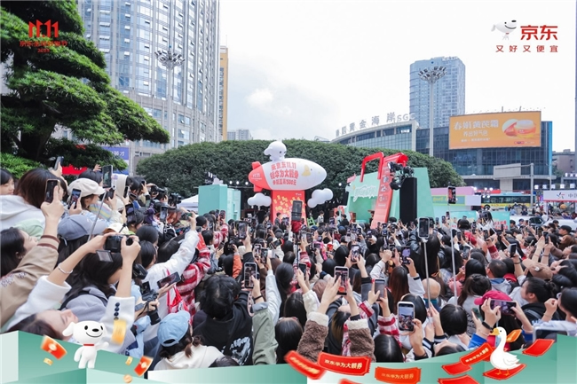 线上声量高涨的同时,线下体验亦同步引爆。京东旅行于10月29日至11月2日,联合华为、伊利、领克、富士等品牌,在重庆潮流地标观音桥推出跨界融合场景营销快闪活动,构建“互动-体验-转化”闭环: