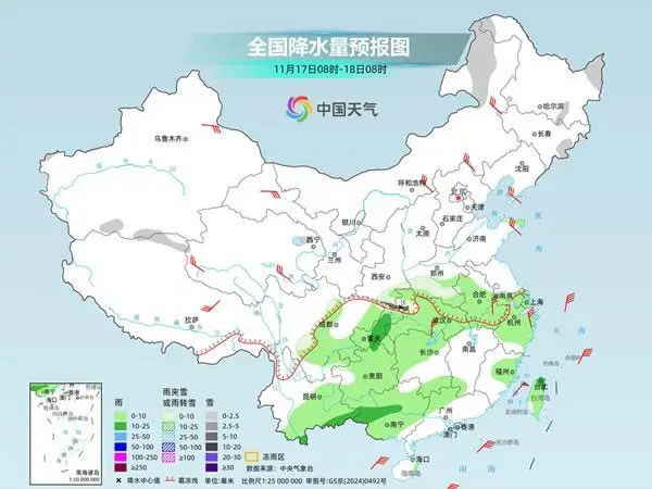 今明两天(11月17日至18日),寒潮继续给我国中东部带来大风、降温天气,气温将自北向南陆续跌入低谷,并且会大面积创下半年来新低。与此同时,寒潮带来的降雪今天将逐渐减弱结束,南方阴雨有所增多,明天起全国大部将转为晴朗干燥的天气格局。