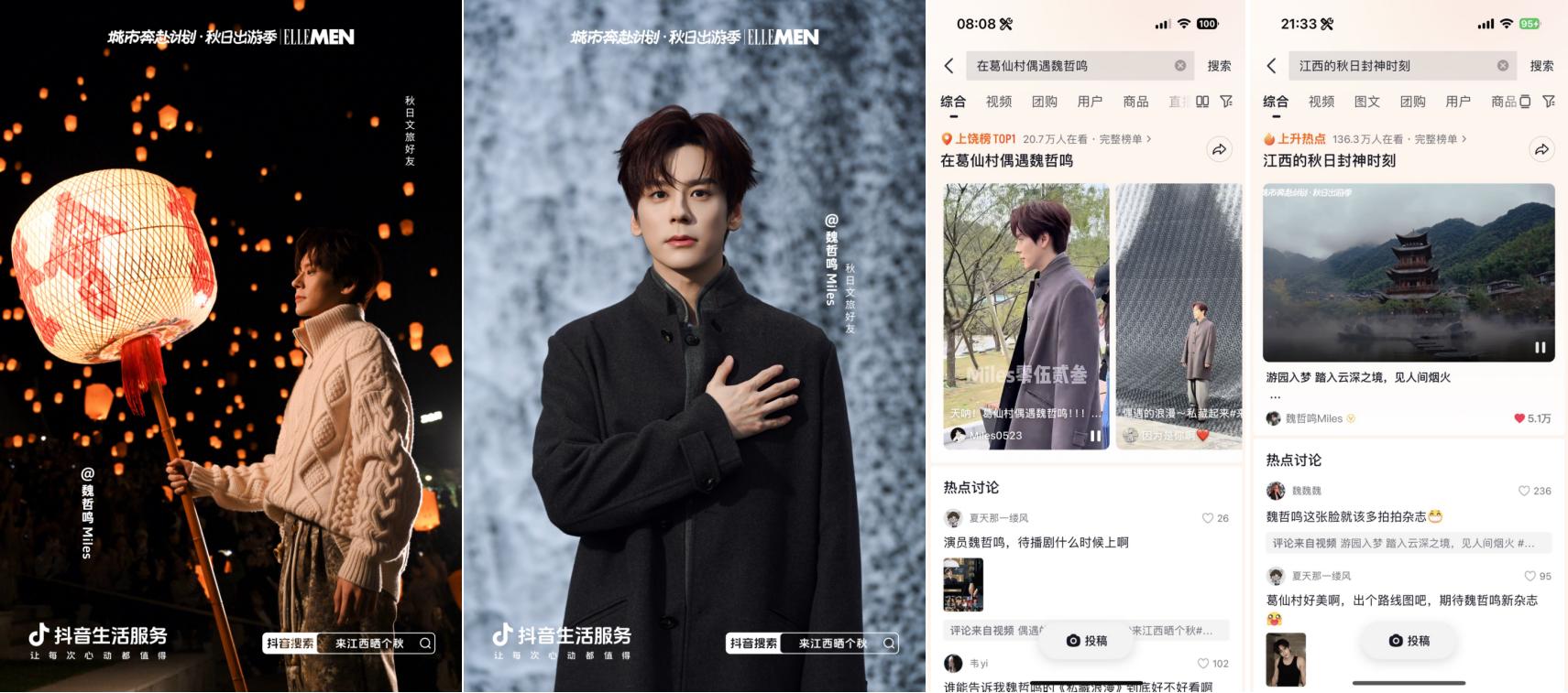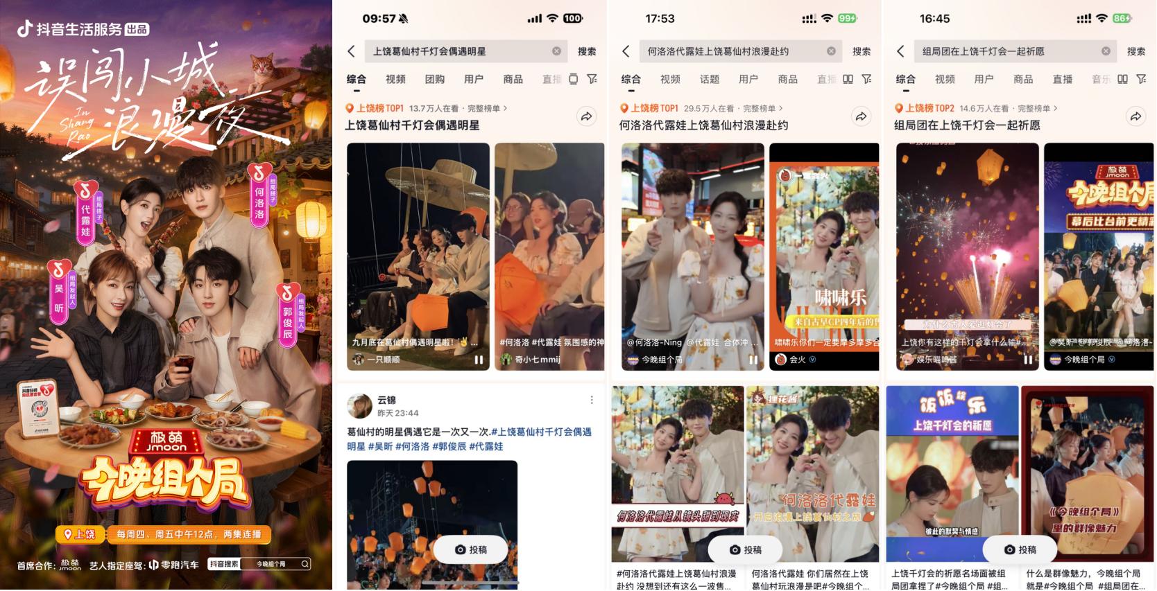 抖音牵手“秋日男友”魏哲鸣前往江西上饶葛仙村拍摄文旅宣发视频引发广泛关注,路透内容#在葛仙村偶遇魏哲鸣 登上上饶同城榜TOP1;主视频发布后,#江西的秋日封神时刻 更登顶同城榜及全国种草榜TOP6。活动还与综艺《今晚组个局》实现联动,吴昕、代露娃、郭俊辰、何洛洛等明星演员前往上饶拍摄定制化文旅内容,#上饶葛仙村千灯会偶遇明星 #何洛洛代露娃上饶葛仙村浪漫赴约 等路透内容与节目看点登顶上饶同城榜TOP1,#组局团在上饶千灯会一起祈愿 抢占同城榜TOP2。明星效应有效激发用户出行意愿,葛仙村交易额同比403%显著增长,持续引爆目的地&商家出圈。