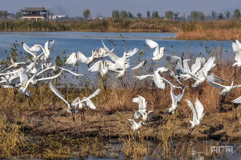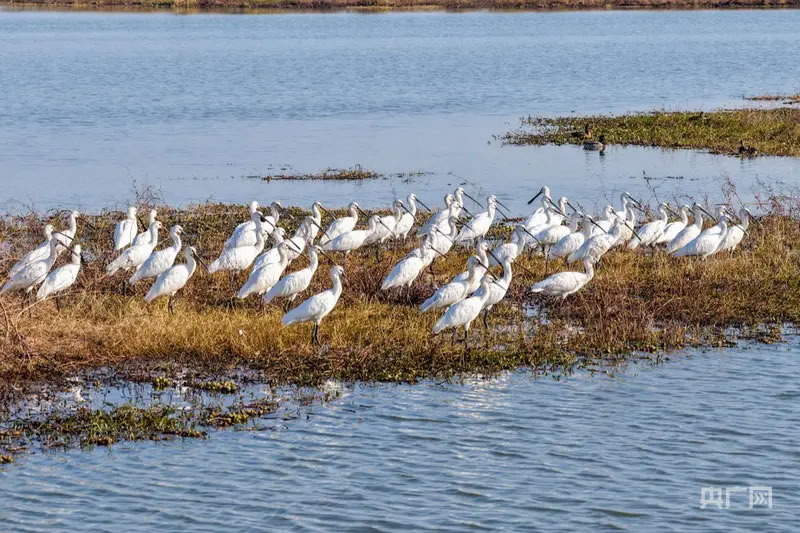庐江县沿黄陂湖环境综合整治退渔还湖规划,整治总面积近20平方公里。这群白琵鹭的翩然而至,不仅是黄陂湖湿地生态环境建设成果的生动体现,也吸引了不少摄影爱好者和游客前来观赏。大家纷纷在安全距离外,用镜头记录下这人与自然和谐共处的美丽画卷,见证着这片土地的蓬勃生机。