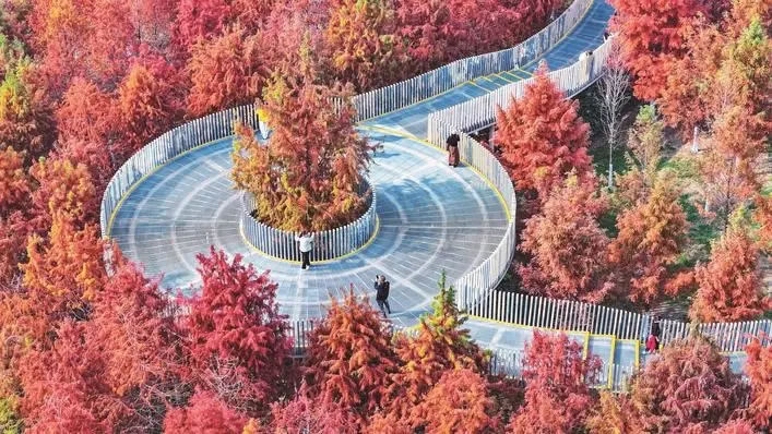 12月15日,汉口常青人才公园,大片火红的杉树林和空中观景栈道完美适配,随手一拍都是冬日美图大片,成为市民热门的打卡地。经历上一轮寒潮,武汉水杉、池杉、落羽杉齐刷刷变红,红杉进入最佳观赏期。 楚天都市报极目新闻记者李辉摄