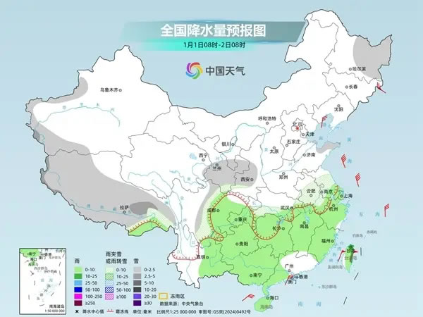 除了降温,冷空气还将带来大范围雨雪天气。随着冷空气南下与暖湿气流交汇,今天至2026年1月1日,中东部将现大范围雨雪,陕西中南部、山西南部、河南西部、湖北西部部分高海拔地区有大雪或暴雪,最强降雪时段为2025年12月31日至2026年1月1日早晨。