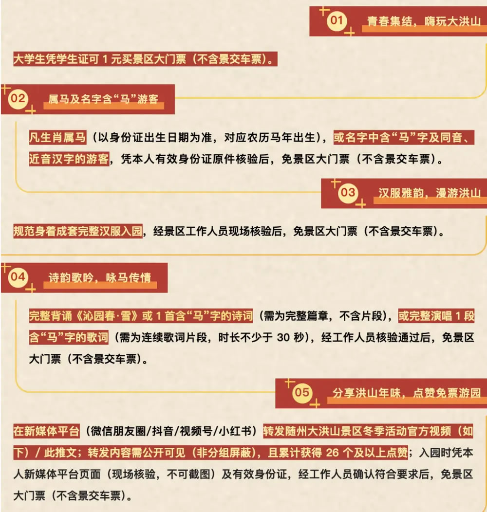 此外,随州大洪山风景名胜区发布的消息还显示,规范身着成套完整汉服入园,经景区工作人员现场核验后,免景区大门票(不含景交车票);完整背诵《沁园春·雪》或 1 首含“马”字的诗词(需为完整篇章,不含片段),或完整演唱 1 段含“马”字的歌词(需为连续歌词片段,时长不少于 30 秒),经工作人员核验通过后,免景区大门票(不含景交车票)。