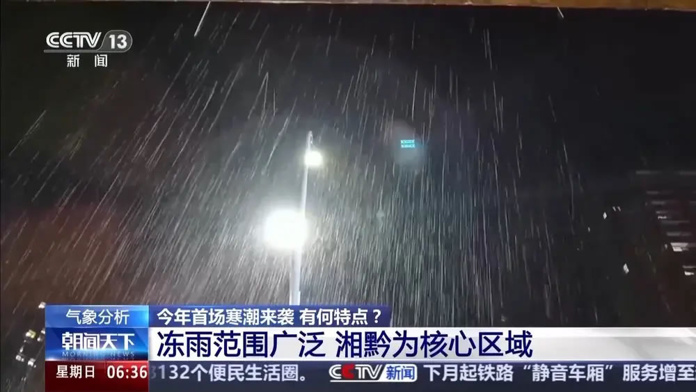 这是今冬首轮大范围的冻雨天气。寒潮渗透南下,在近地面形成冷垫。大气的中层暖湿气流发展,所以整层大气特别容易形成上冷中间暖近地面也冷的格局,有利于冻雨的形成。