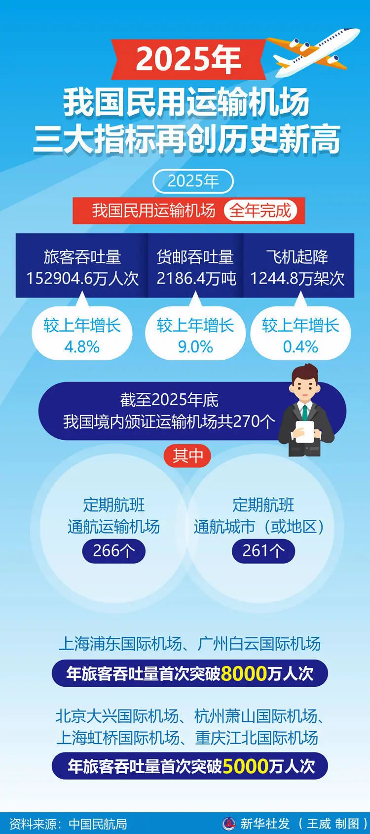 新华社北京2月26日电(记者王聿昊)记者26日从中国民航局获悉,2025年,我国民用运输机场三大主要生产指标再创历史新高,全年完成旅客吞吐量152904.6万人次、货邮吞吐量2186.4万吨、飞机起降1244.8万架次,较上年分别增长4.8%、9.0%、0.4%。