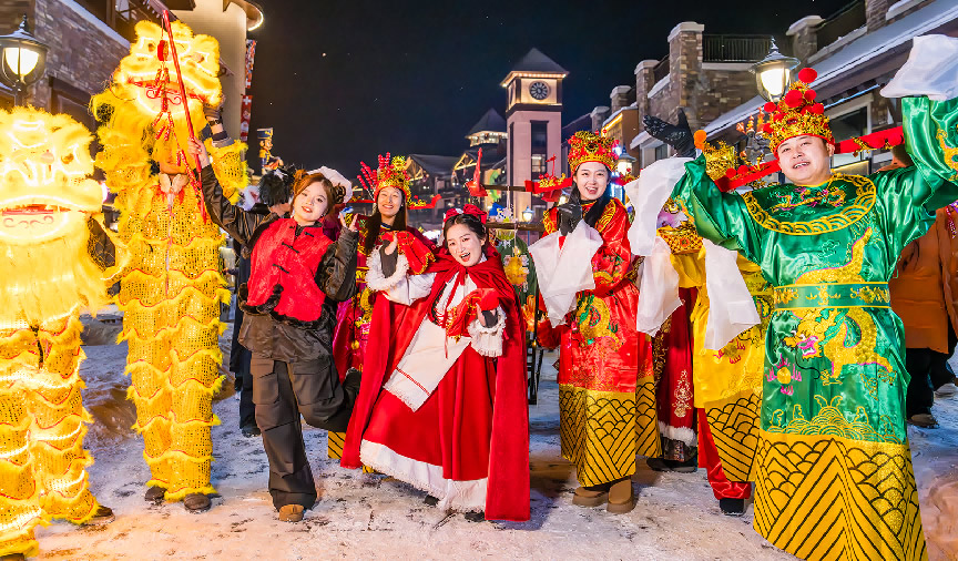 夜幕降临,巡游队伍走上度假区的街头,让游客在冰天雪地中感受到浓浓热情。
