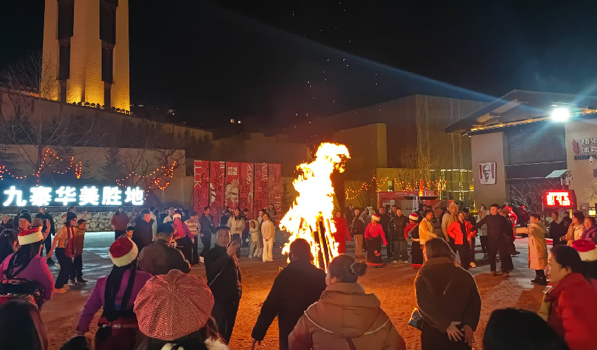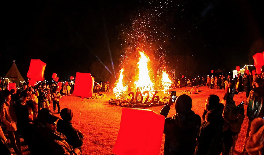 在京南华美胜地,游客们欢聚一堂,点燃跨年篝火,庆祝新年到来。