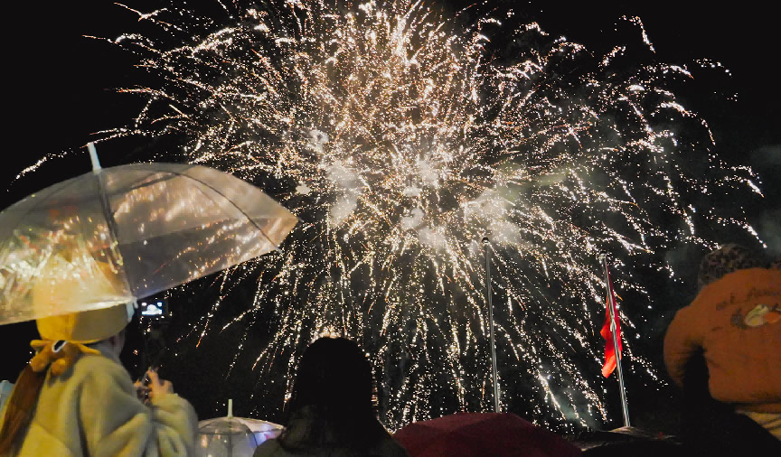 千岛湖畔,除夕烟花秀吸引了众多游客围观。