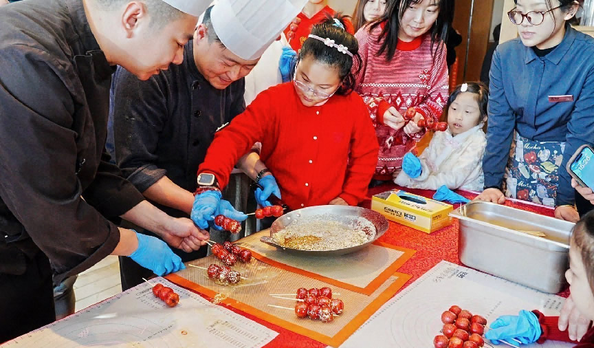 在工作人员的指导下,游客们体验手工制作糖葫芦。