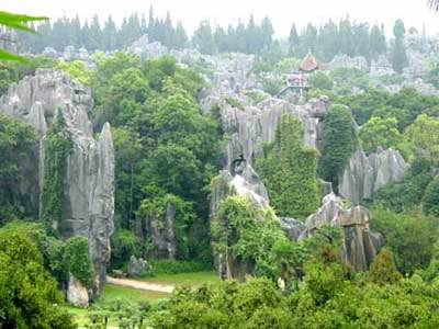 位于距昆明市78公里的路南县境内。该县是我国岩溶地貌(也称喀斯特地貌)比较集中的地区,全县共有石林面积400平方公里。景区由大、小石林、乃古石林、大叠水、长湖、月湖、芝云洞、奇风洞7个风景片区组成。其中石林的像生石,数量多,景观价值高,举世罕见。1982年,经国务院批准定为第一批国家级重点风景名胜区。