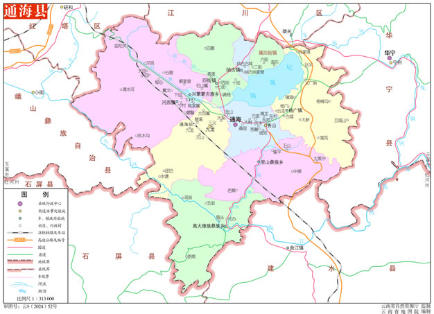 位置境域 通海县地处云南省中南部、玉溪市东部,东与华宁县接壤,西与峨山县、红塔区相邻,南与红河州石屏县、建水县交界,北与江川区毗邻。东西最大横距39.97千米,南北最大纵距36.15千米,总面积721平方千米。距云南省会昆明市125千米,距玉溪市政府所在地红塔区47千米。